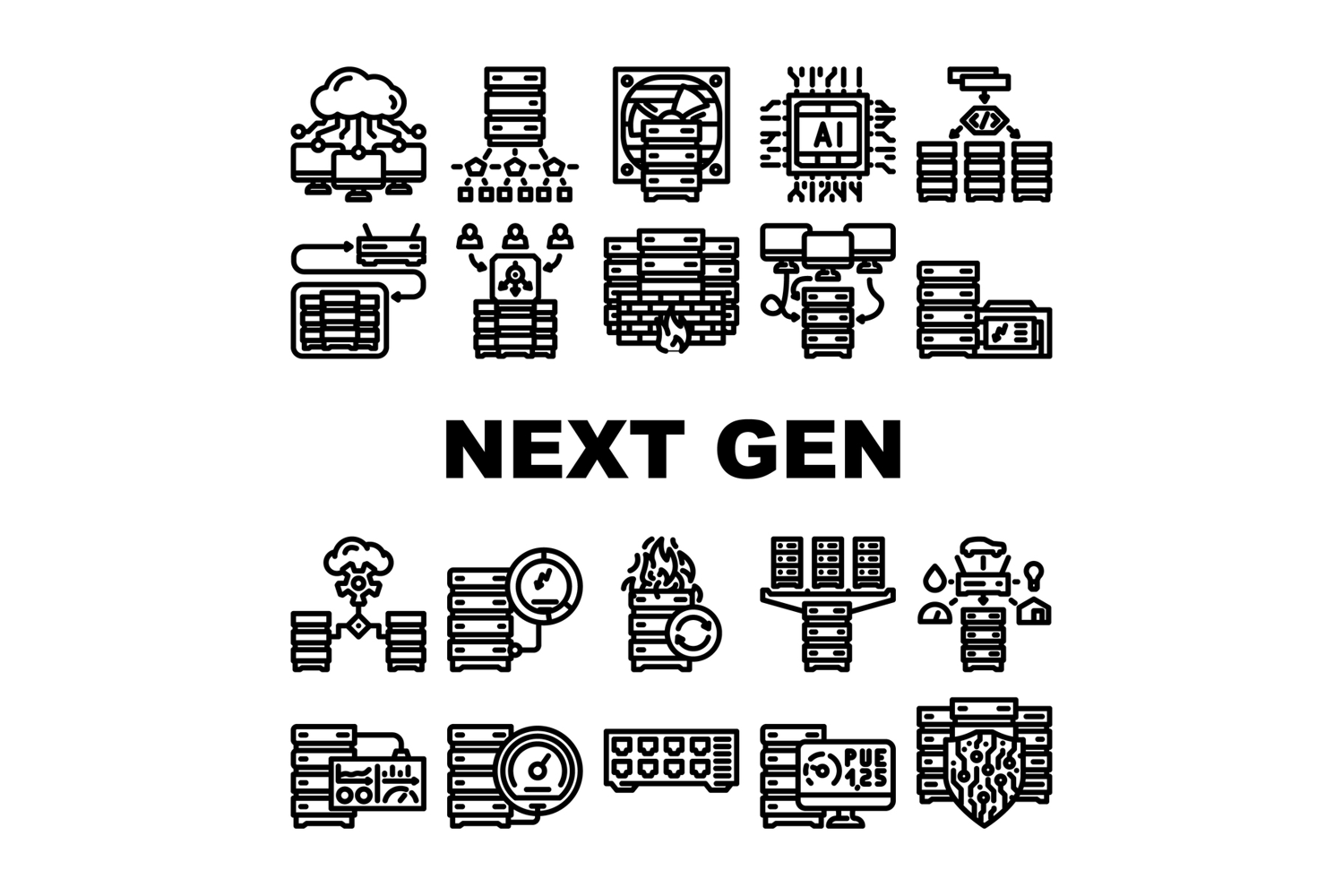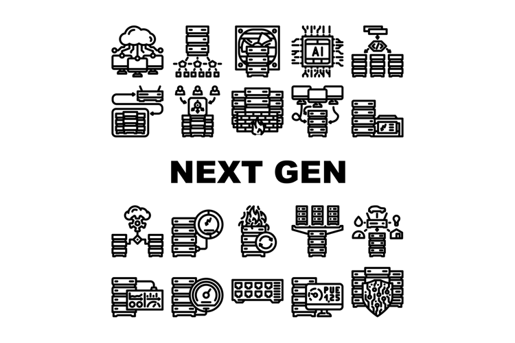 next gen data center virtual icons set vector. automation scalability, efficiency sustainability, cloud, edge, ai, iot, security next gen data center virtual black contour illustrations