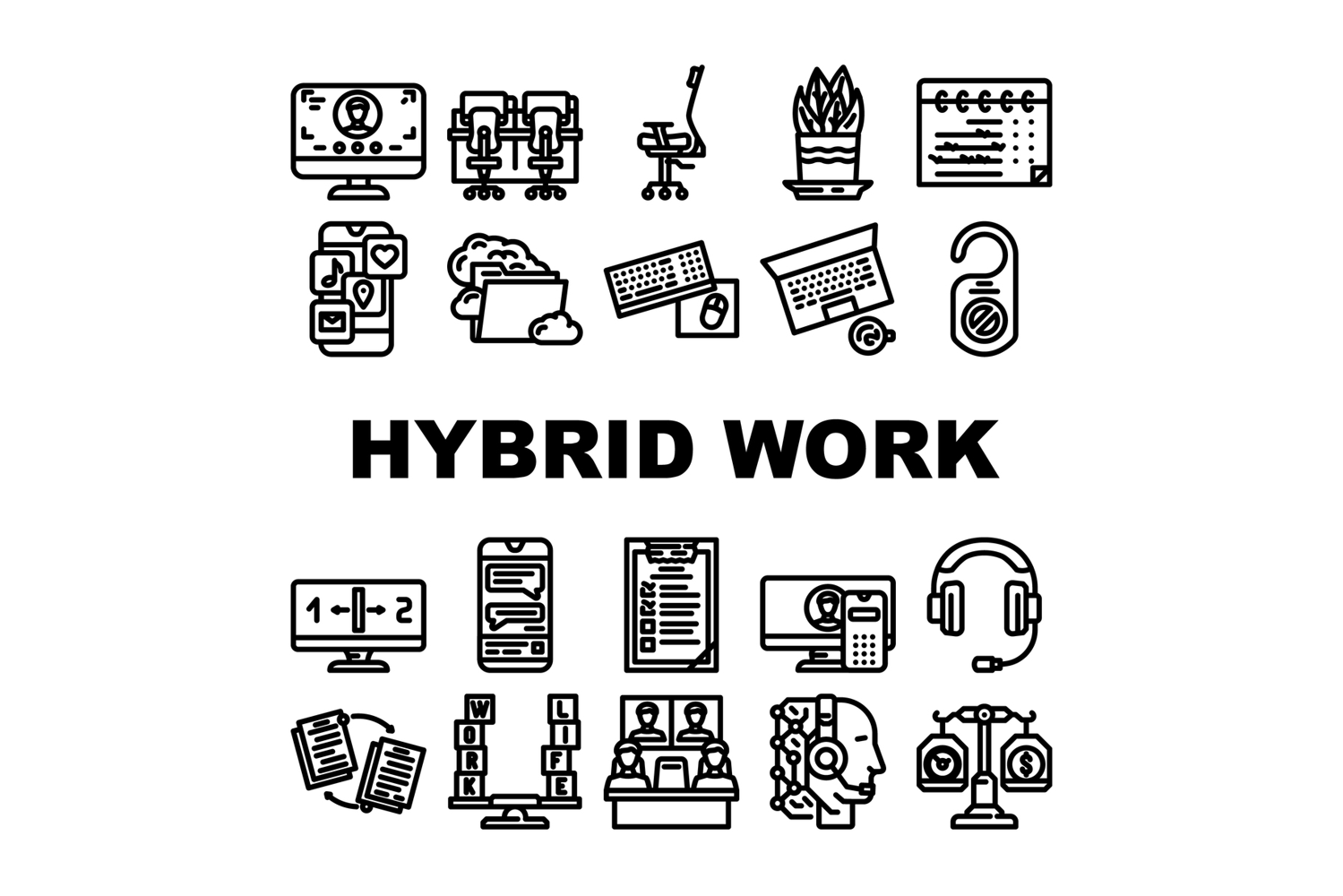 hybrid work model remote icons set vector. flexible, collaboration productivity, technology communication, balance, efficiency hybrid work model remote black contour illustrations