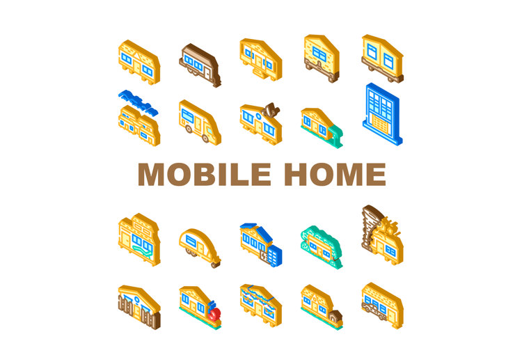 mobile home trailer icons set vector. modular community, prefab, transportable, portable, downsizing, affordable mobile home trailer isometric sign illustrations
