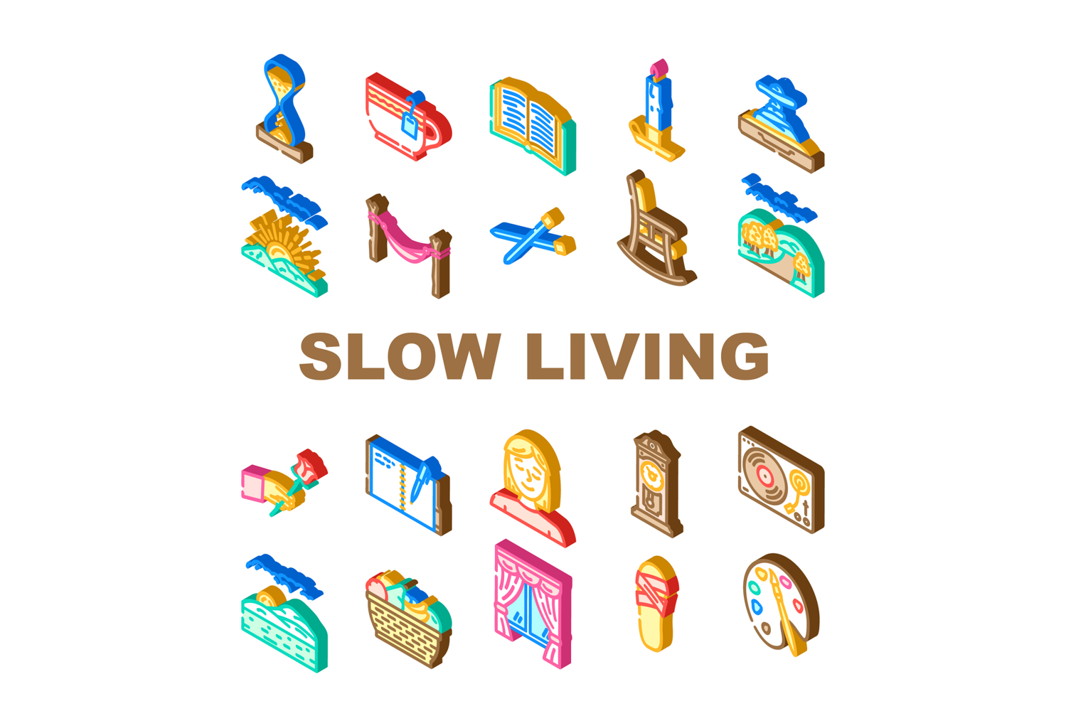 slow living mindfulness icons set vector. simplicity, intentionality balance, presence, minimalism tranquility, sustainability slow living mindfulness isometric sign illustrations