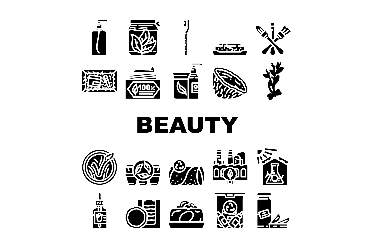 sustainable beauty eco friendly icons set vector. organic, vegan, natural, clean, green, ethical, cruelty, free, biodegradable sustainable beauty eco friendly glyph pictogram Illustrations