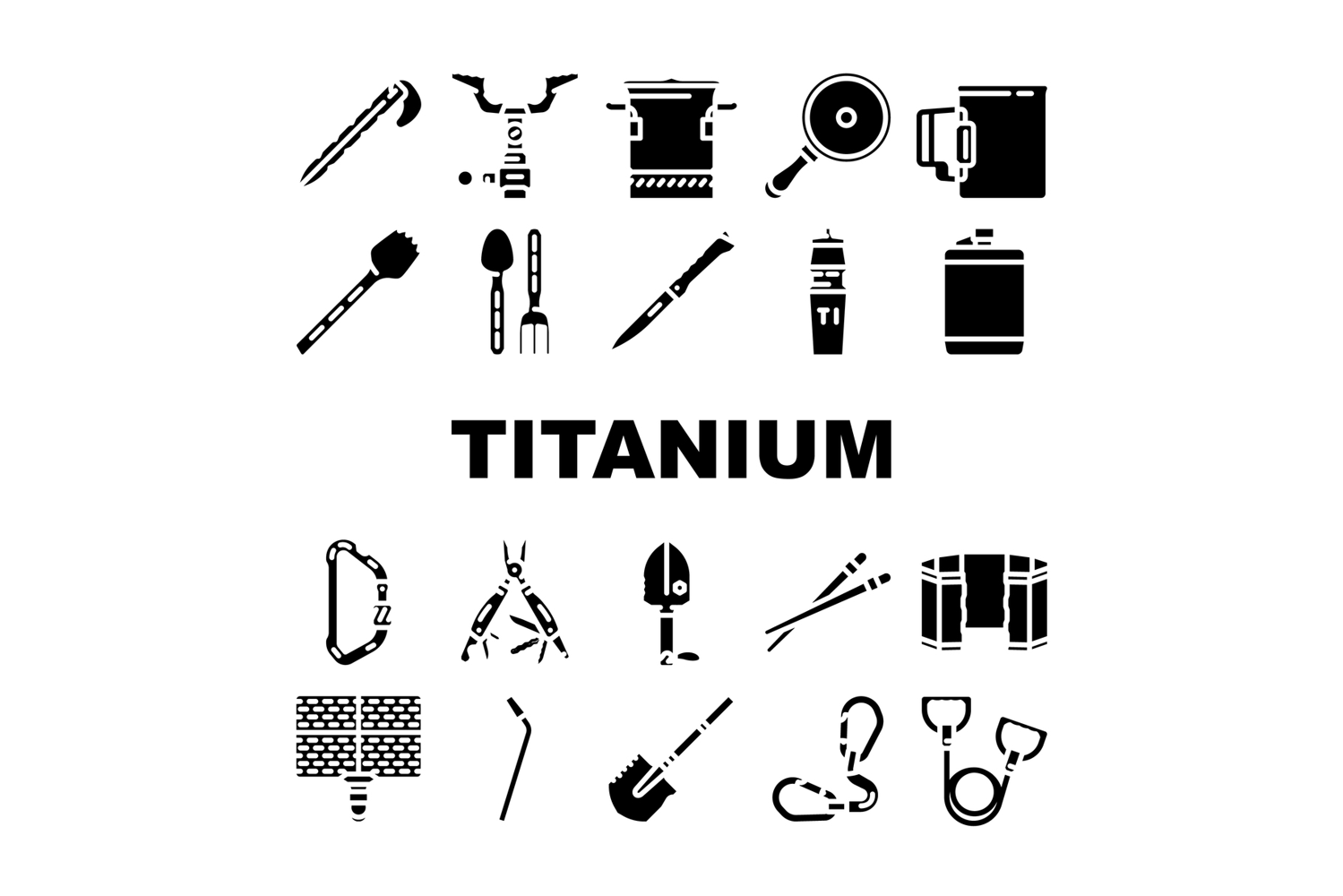 titanium accessories jewelry icons set vector. bracelet, ring, necklace, earrings, watch, pendant, band, chain, studs titanium accessories jewelry glyph pictogram Illustrations