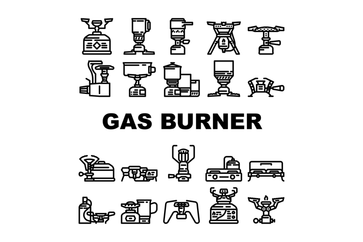 gas burner stove cooktop icons set vector. flame, ignition, propane, butane, natural heat, simmer, grill, range, hob gas burner stove cooktop black contour illustrations