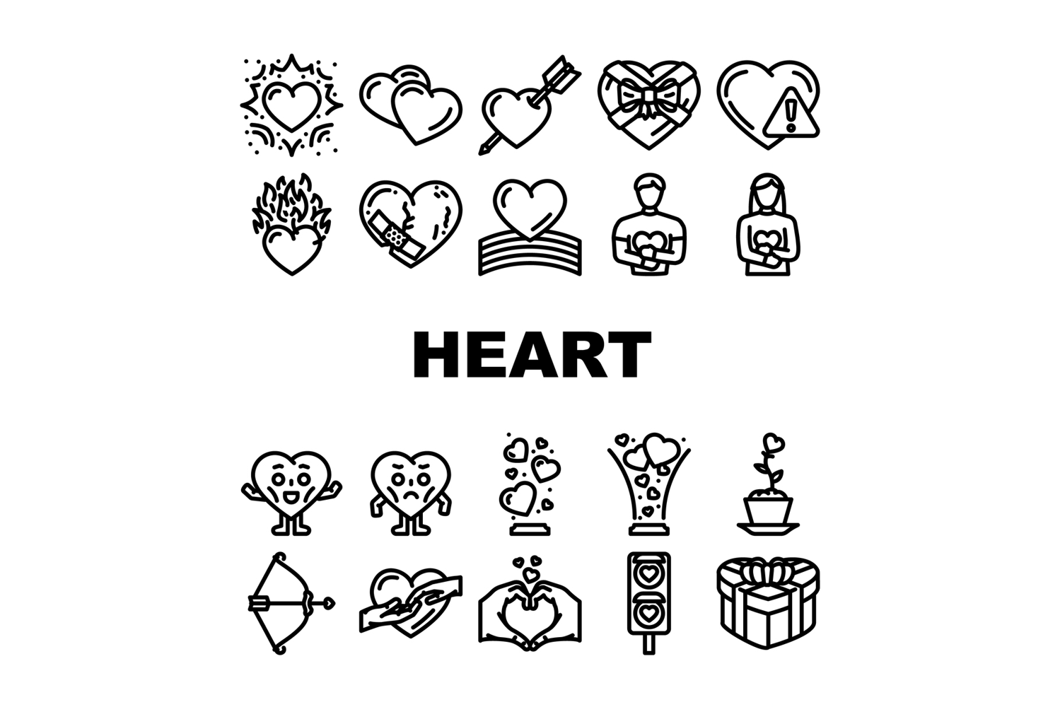 heart love romance icons set vector. affection, passion emotion, connection relationship, devotion adoration, tenderness heart love romance black contour illustrations