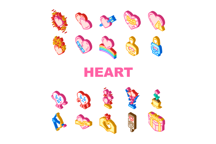heart love romance icons set vector. affection, passion emotion, connection relationship, devotion adoration, tenderness heart love romance isometric sign illustrations