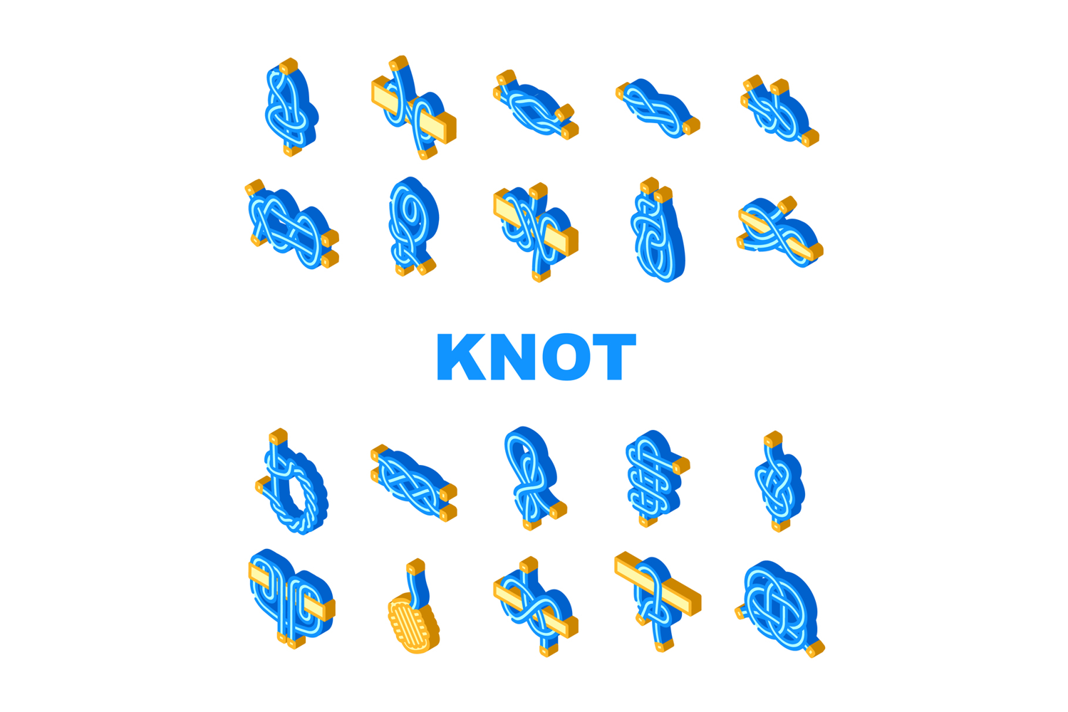 nautical knot marine ship icons set vector. bowline clovehitch sheetbend, reef figureeight, cleat halfhitch rollinghitch, prusik nautical knot marine ship isometric sign illustrations