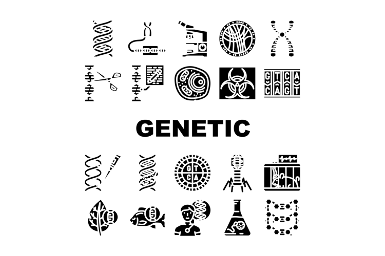 genetic engineering crispr gene icons set vector. genome, editing, biotechnology dna, mutation, cloning transgenic, recombinant genetic engineering crispr gene glyph pictogram Illustrations
