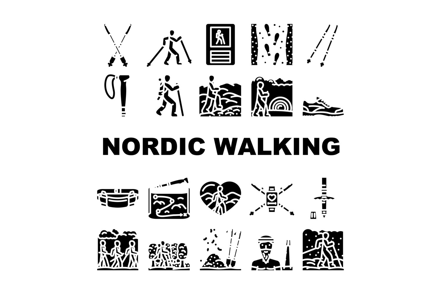 nordic walking fitness exercise icons set vector. poles outdoors, health trekking, technique workout endurance, balance, strength nordic walking fitness exercise glyph pictogram Illustrations
