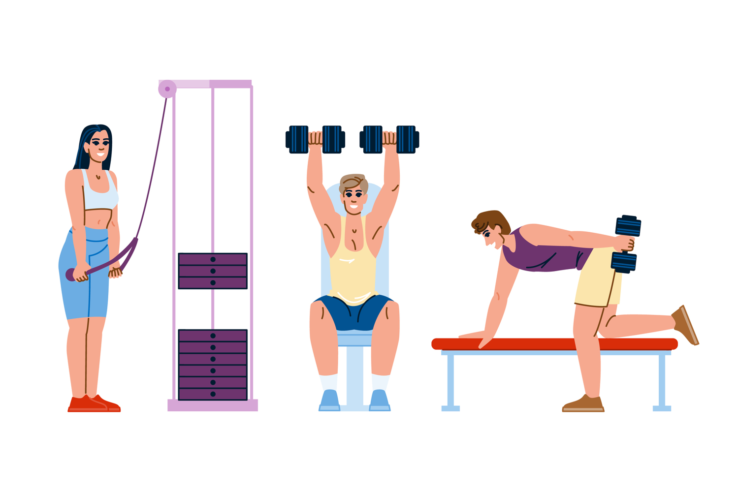 bicep fitness exercises arm vector. tricep curl, dip plank, chinup press bicep fitness exercises arm character. people flat cartoon illustration