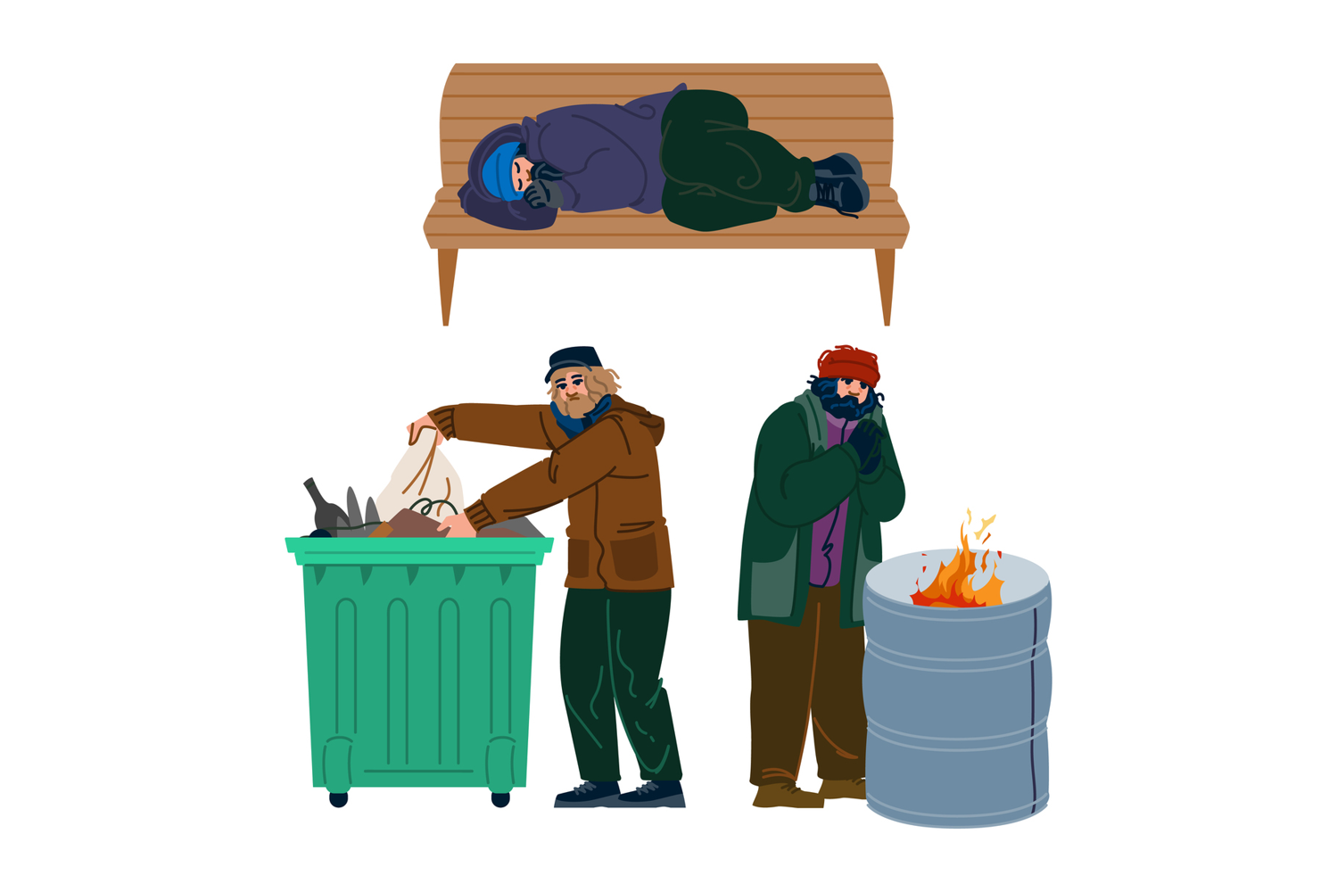 Unhoused individuals experiencing hardship, sleeping on a bench, searching for food in a garbage bin, and warming hands by a barrel fire, depicting life on the streets