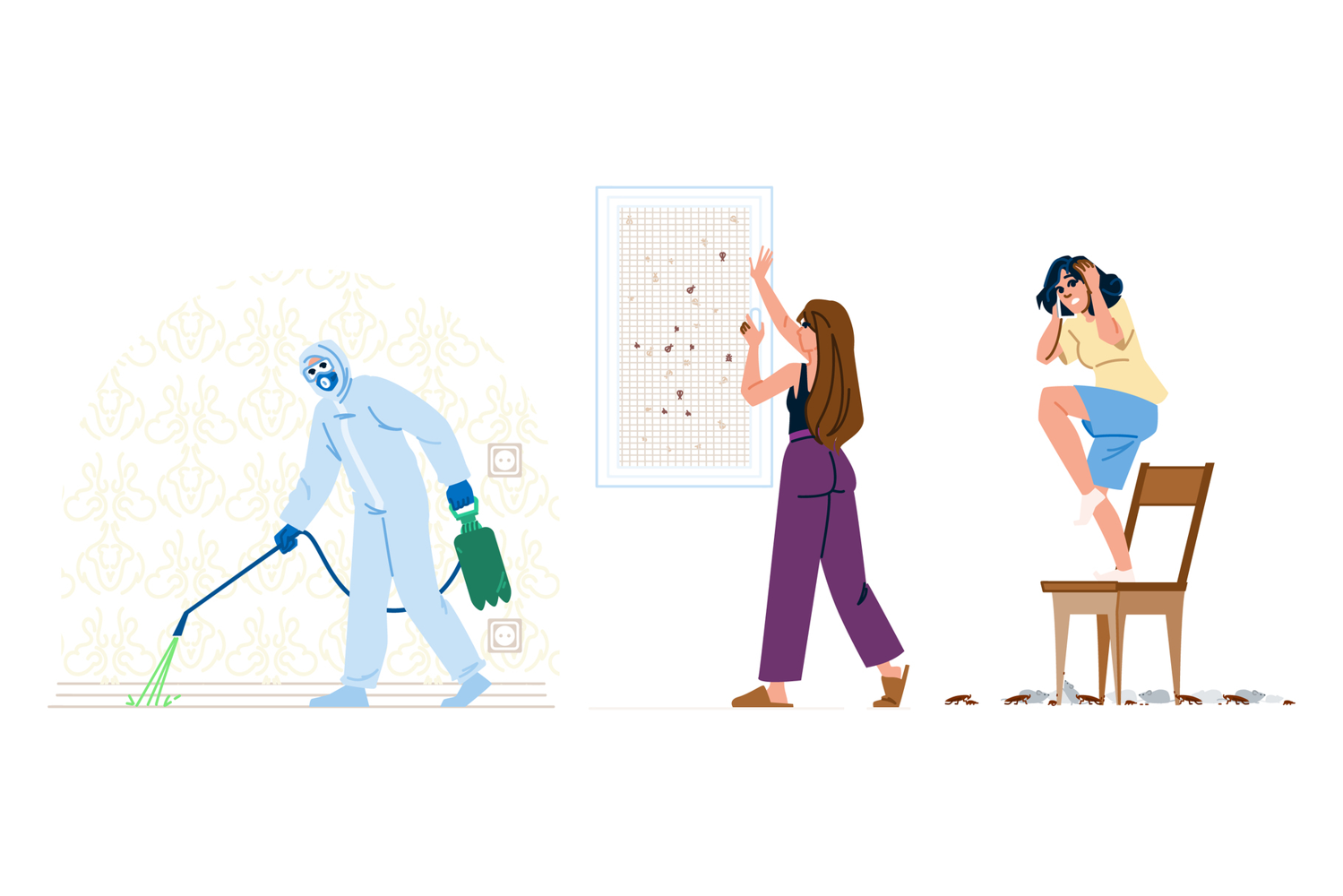 Professional exterminator spraying chemicals, woman finding bugs on a trap, and another woman scared by cockroaches, illustrating various stages of home pest management