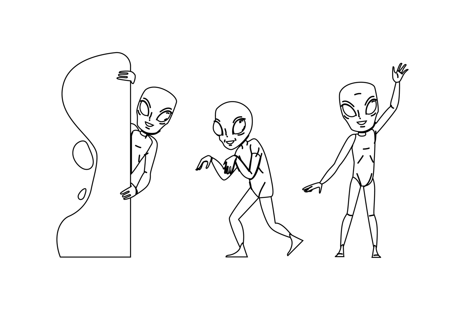 space alien vector. ufo extraterrestrial, character fiction, galaxy spaceship space alien character. people black line pencil drawing illustration