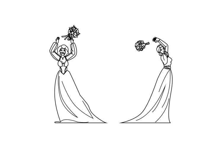 bride bouquet toss vector. reception catch, fun ritual, event custom bride bouquet toss character. people black line pencil drawing illustration