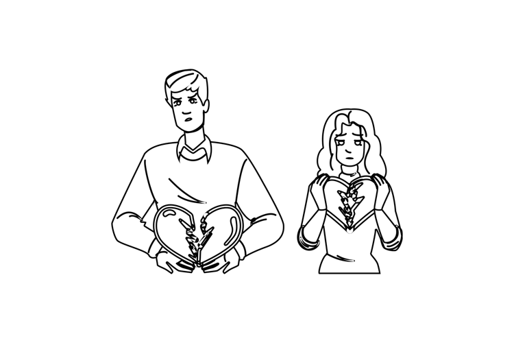 healing broken heart vector. grief loss, regret tears, sorrow despair healing broken heart character. people black line pencil drawing illustration