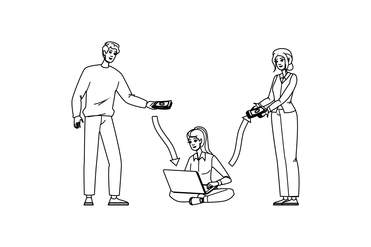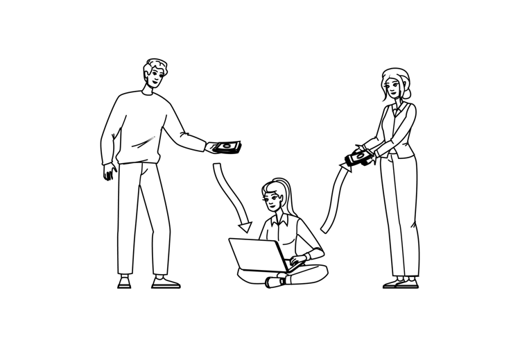 insurance compensation management vector. money business, vacation benefit, health job insurance compensation management character. people black line pencil drawing illustration
