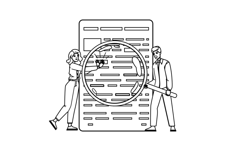 strategy content gap analysis vector. seo keywords, competition research, website performance strategy content gap analysis character. people black line pencil drawing illustration