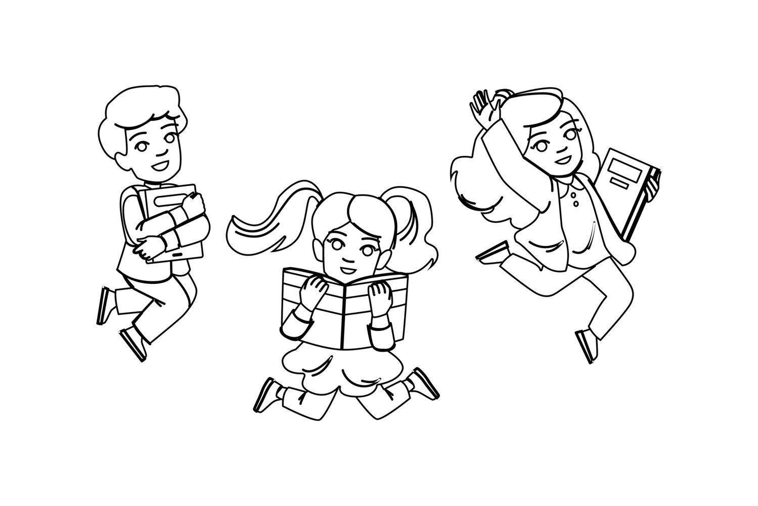 young excited kids reading vector. book happy, education person, school study young excited kids reading character. people black line pencil drawing illustration