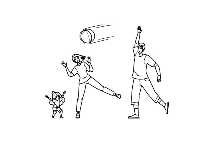 play family playing catch vector. fun bonding, outdoors game, ball toss play family playing catch character. people black line pencil drawing illustration