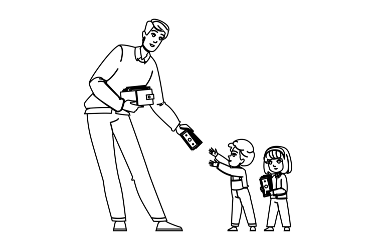 savings give money kid vector. budget wealth, generosity support, fund investment savings give money kid character. people black line pencil drawing illustration