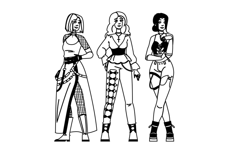 victorian gothic woman fashion vector. steampunk bohemian, alternative punk, romantic occult victorian gothic woman fashion character. people black line pencil drawing illustration