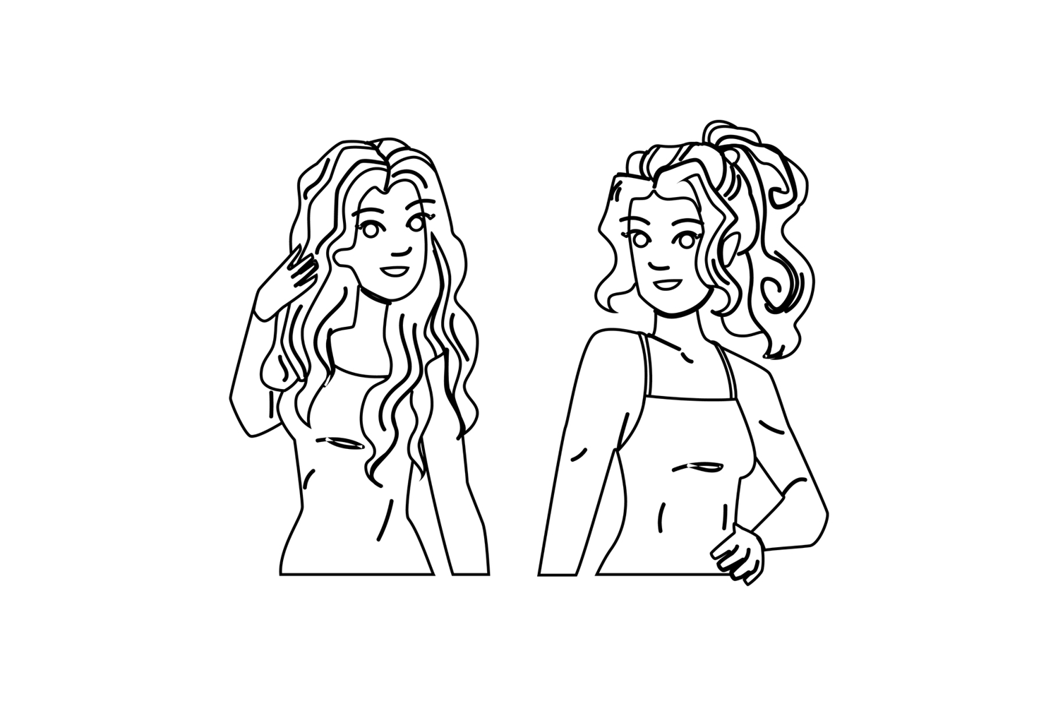 model hairstyle woman vector. long care, straightener style, brown mirror model hairstyle woman character. people black line pencil drawing illustration