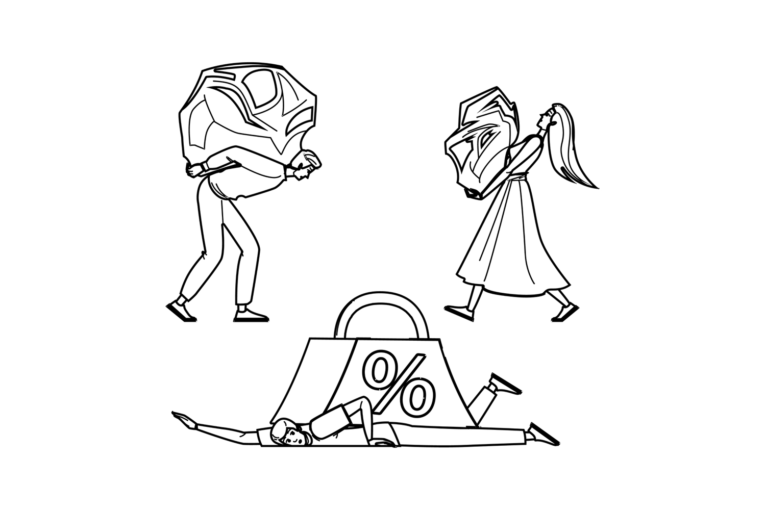 interest heavy finance burden vector. credit bankruptcy, mortgage overdraft, foreclosure recession interest heavy finance burden character. people black line pencil drawing illustration