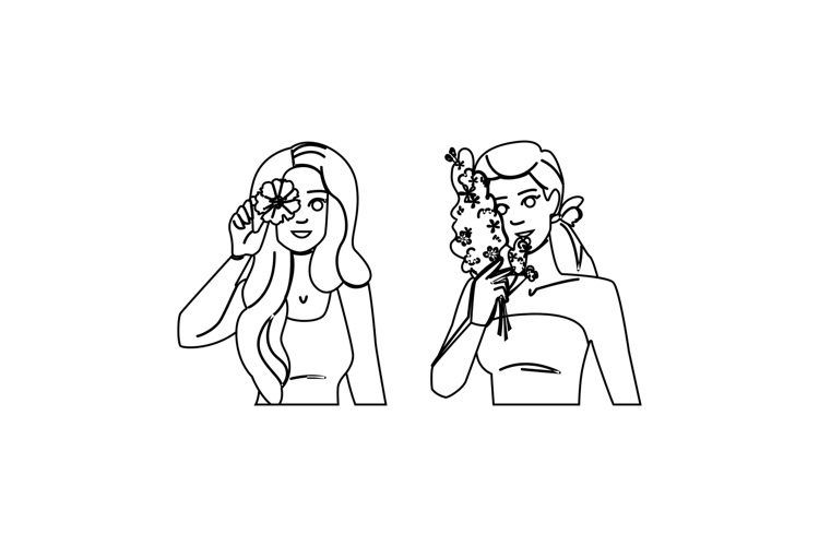 grace holding flower woman vector. beauty elegance, serenity pose, nature petals grace holding flower woman character. people black line pencil drawing illustration