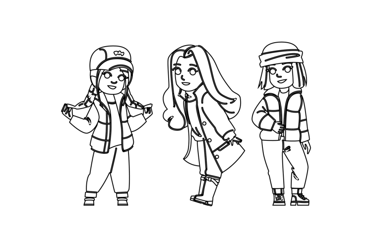 boots kid girl autumn fashion vector. scarf jacket, dress hat, coat cardigan boots kid girl autumn fashion character. people black line pencil drawing illustration