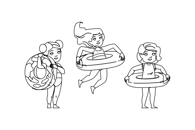 vacation kid girl inflatable ring vector. swim happy, beach child, blue s vacation kid girl inflatable ring character. people black line pencil drawing illustration