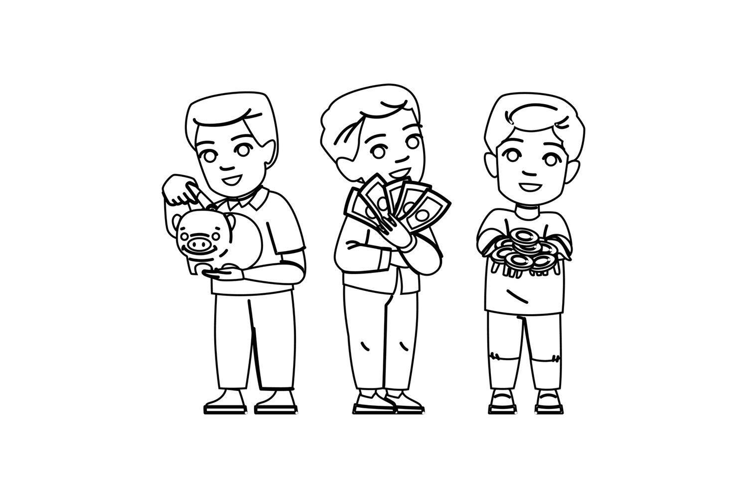 save kid money boy vector. rich young, black salary, business piggybank save kid money boy character. people black line pencil drawing illustration