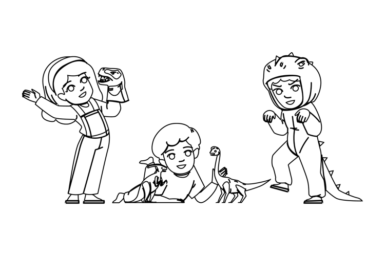 cute kids dinosaurs vector. dino character, baby fun, children boy cute kids dinosaurs character. people black line pencil drawing illustration