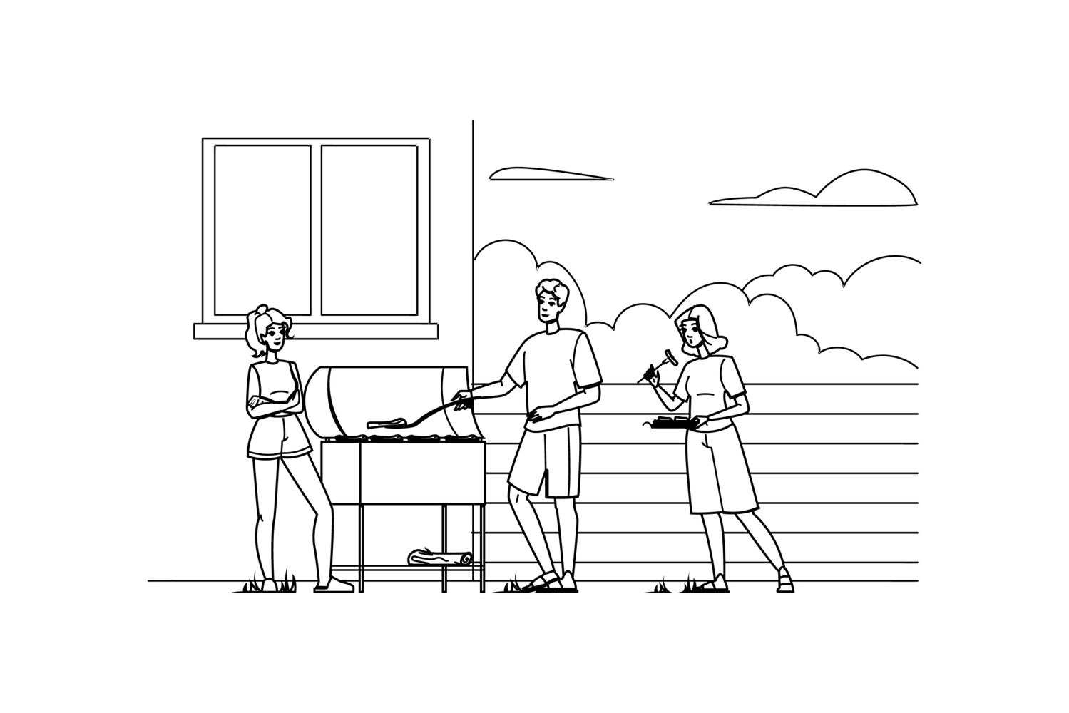 food outdoor cooking vector. grill bbq, party meat, barbecue barbeque food outdoor cooking character. people black line pencil drawing illustration