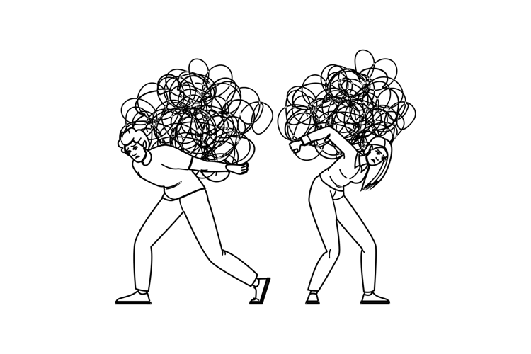pressure stress burden vector. overwhelm fatigue, burnout strain, di exhaustion pressure stress burden character. people black line pencil drawing illustration