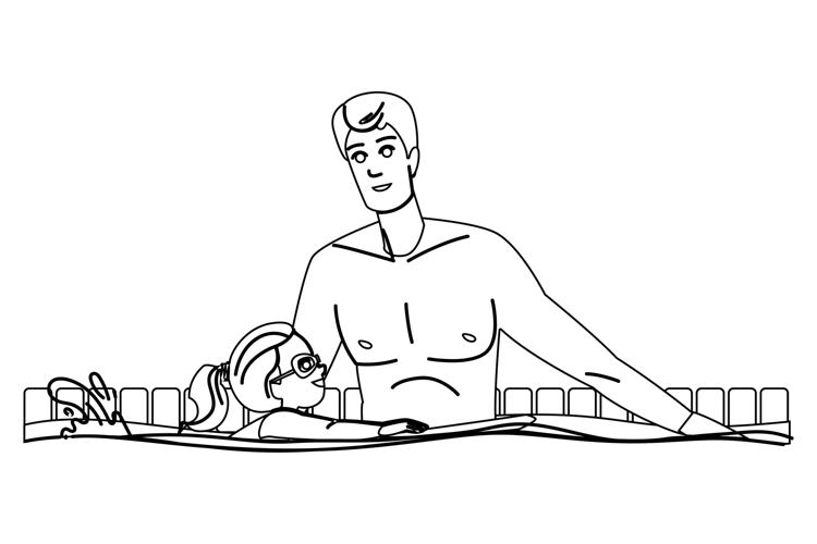 water teaching kid swim pool vector. skills dive, splash stroke, breathe kick water teaching kid swim pool character. people black line pencil drawing illustration