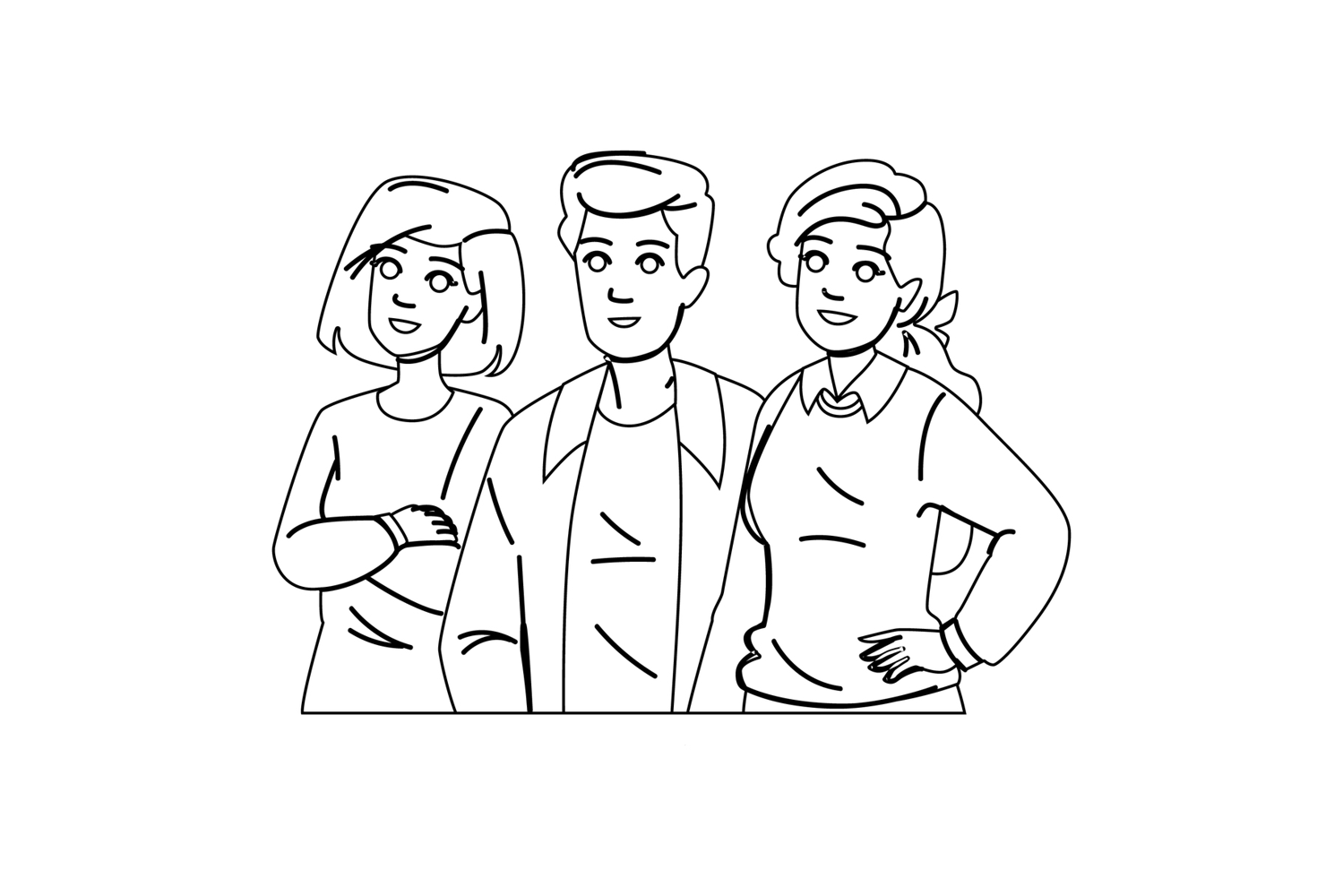 happy team group vector. work work, diverse men, community man happy team group character. people black line pencil drawing illustration
