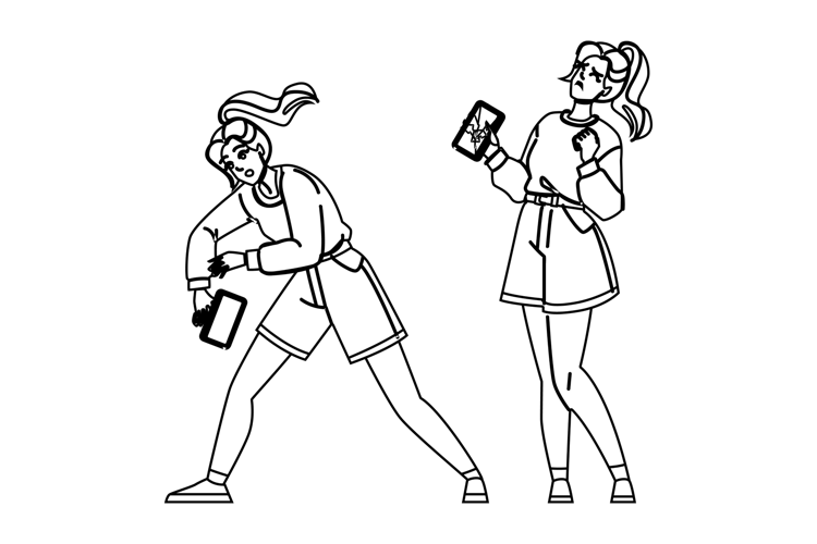 cracked woman broken phone vector. replacement fix, shattered insurance, warranty protection cracked woman broken phone character. people black line pencil drawing illustration