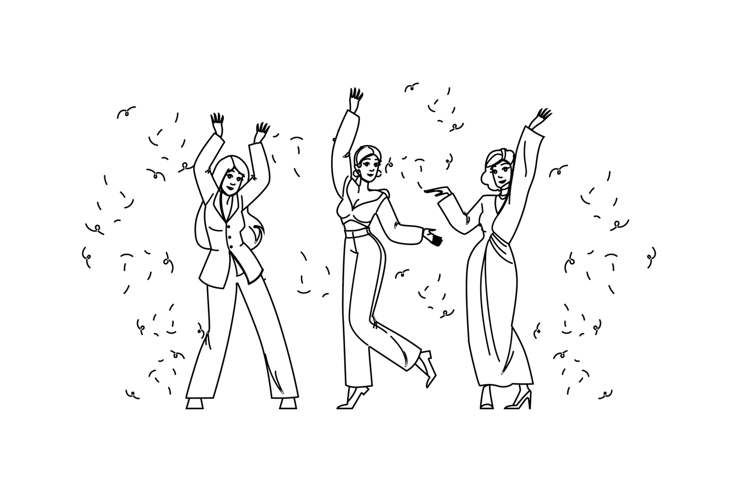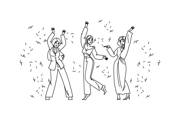 happiness woman confetti vector. empowerment strength, unity diversity, equality sparkle happiness woman confetti character. people black line pencil drawing illustration
