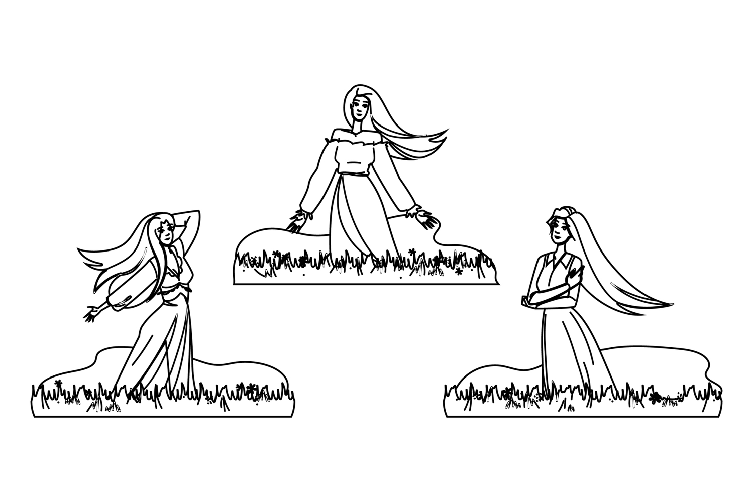 breeze woman field hair blowing vector. nature freedom, beauty elegance, empowerment grace breeze woman field hair blowing character. people black line pencil drawing illustration