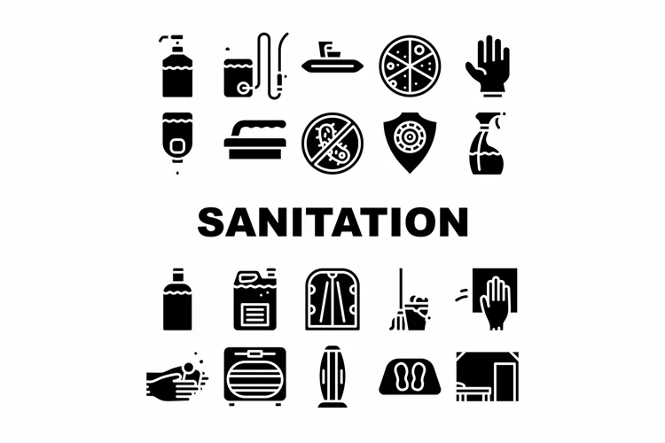 Sanitation Accessories Collection Icons Set Vector. Sanitation Equipment And Tool, Anti-virus Protection Brush Glove, Disinfection Spray Liquid Glyph Pictograms Black Illustrations