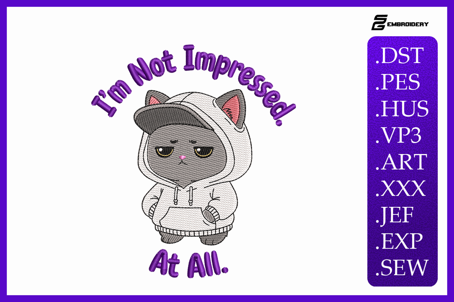 This Sassy Cat Quote Embroidery Design brings personality and humor to any embroidery project. With the phrase “I’m Not Impressed At All” and a fun cat theme, it’s great for apparel, home décor, and personalized gifts. A trendy and playful embroidery design for cat moms, cat dads, and anyone who loves cat attitude.