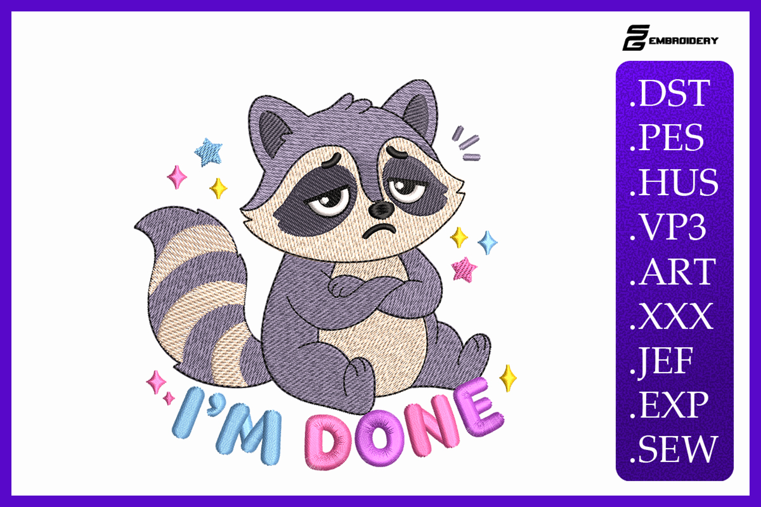 "I'm Done" Sarcastic Raccoon Embroidery Designs