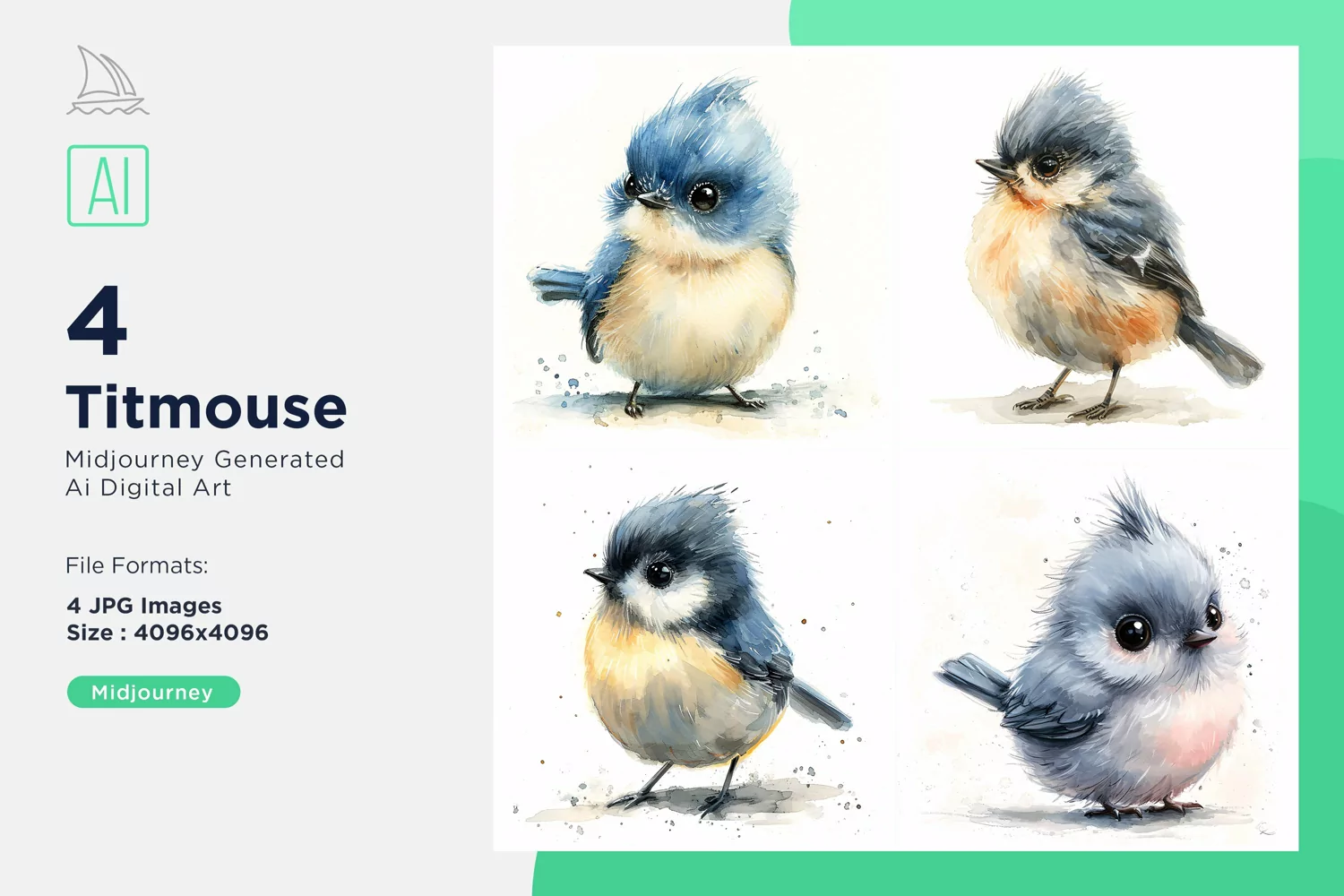 Cute Titmouse Bird Baby Watercolor illustration Set 4