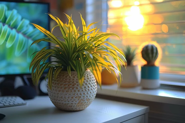 A Minimalist Scandinavian interior home office features a clean, serene design with a workstation, ergonomic chair, and desk. Natural sunlight streams through the window, illuminating a cosy couch sofa and plants in a vase. This setup combines functionality with simplicity, perfect for productivity and relaxation.
