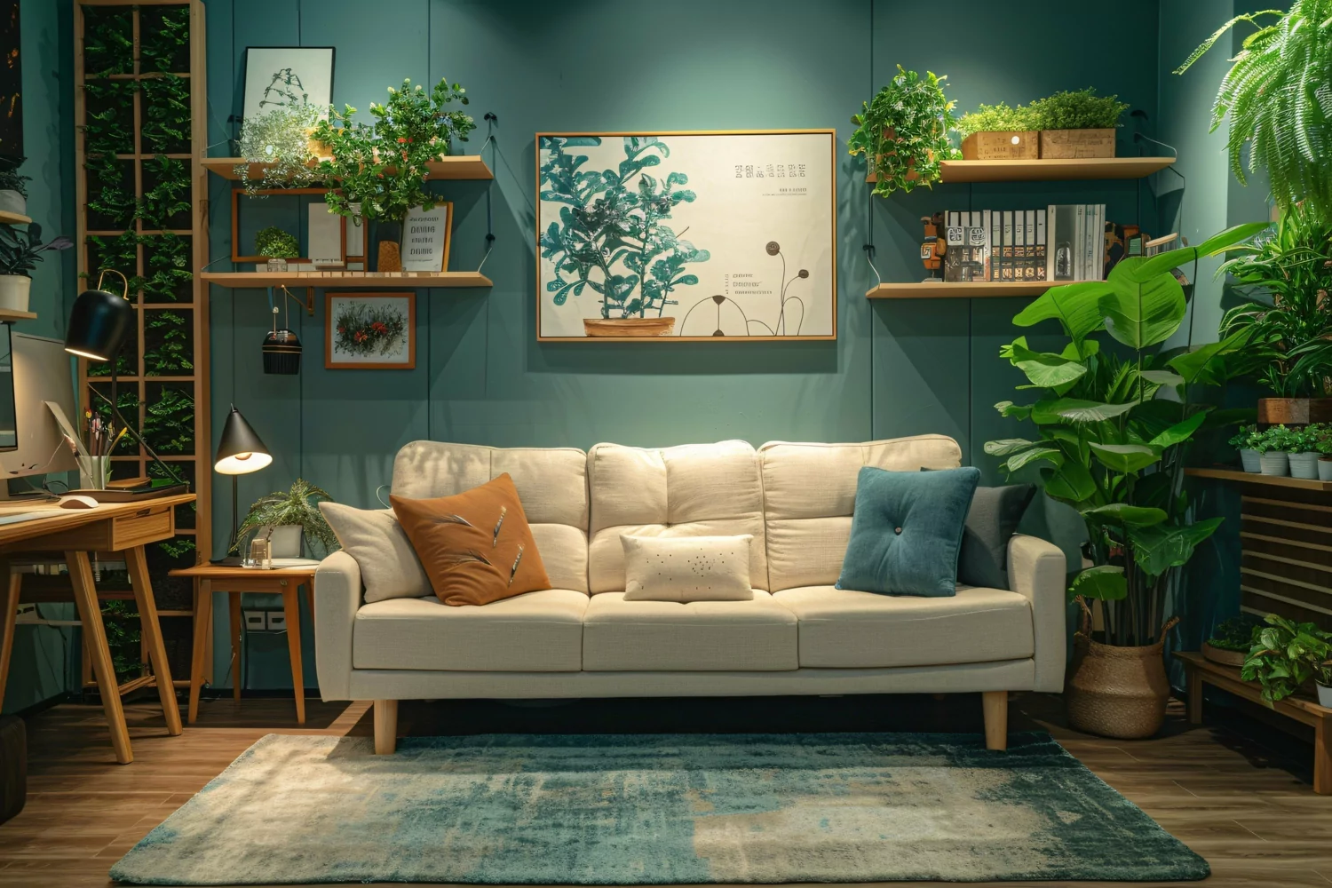 The home living room, adorned with minimalist Scandinavian elements, includes a large frame, sleek furniture, and thoughtfully placed plants. Books, cards, and digital media are neatly organised, making it ideal for presentations or publishing projects. The overall ambiance is calm and inspiring, promoting creativity and focus in a well-balanced environment.