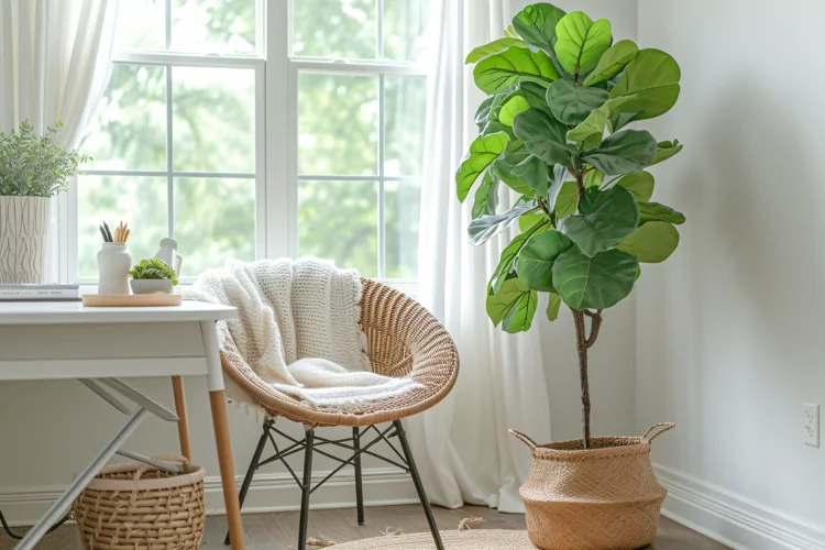 A Minimalist Scandinavian interior home office features a clean, serene design with a workstation, ergonomic chair, and desk. Natural sunlight streams through the window, illuminating a cosy couch sofa and plants in a vase. This setup combines functionality with simplicity, perfect for productivity and relaxation.
