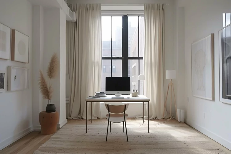 A Minimalist Scandinavian interior home office features a clean, serene design with a workstation, ergonomic chair, and desk. Natural sunlight streams through the window, illuminating a cosy couch sofa and plants in a vase. This setup combines functionality with simplicity, perfect for productivity and relaxation.