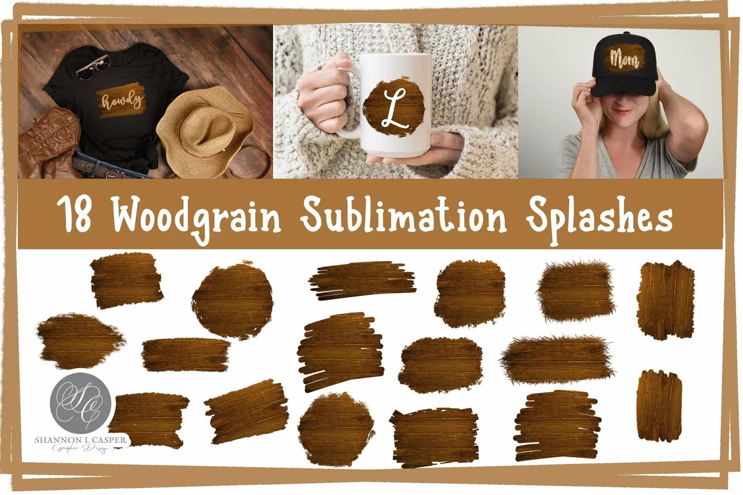 18 woodgrain sublimation splashes - PNG files. High quality and fun to design with.