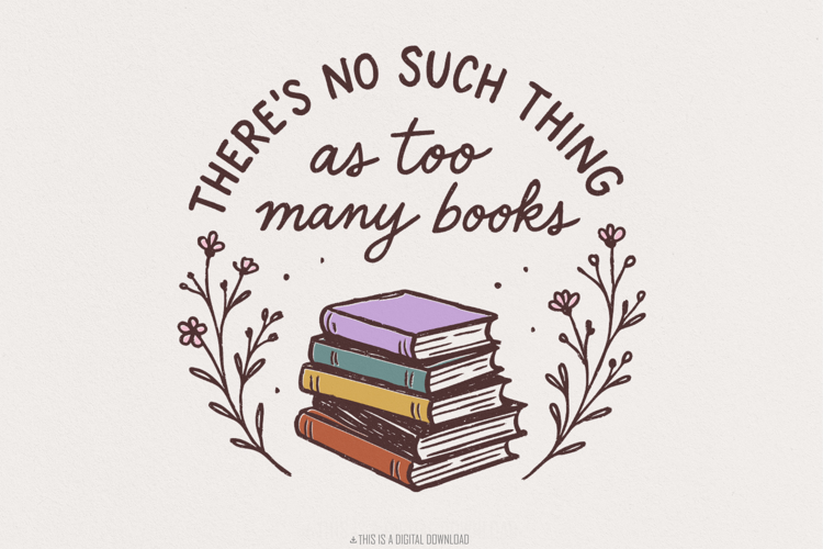 There's No Such Thing as Too Many Books PNG, Book Lover Shirt, Reading Quote Design, Literary PNG Download, Gift for Bibliophile, Floral Art