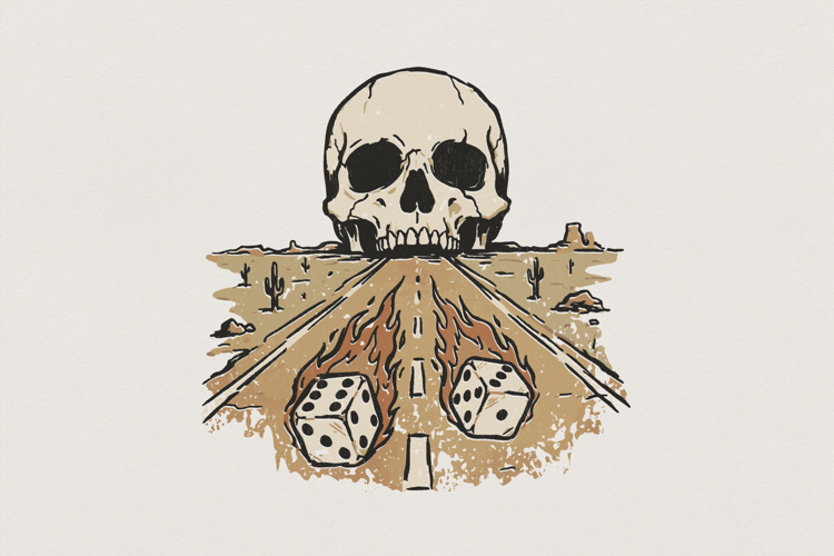 Desert Highway Skull PNG, Dice Flames Art, Western Biker T