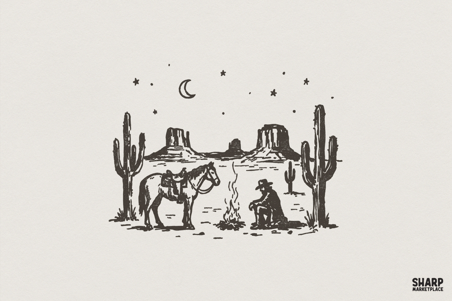 Western Desert Cowboy PNG, Campfire Scene, Vintage Horse Illustration, Cowboy Art PNG, Retro Cactus Landscape, Printable T-Shirt Design